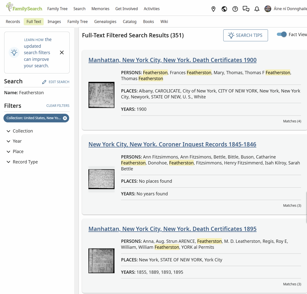 I'm at my FSC this afternoon. My memory did not fail me. I opened full-text search, chose the New York deaths collection and entered one of my ancestral surnames, Featherston: