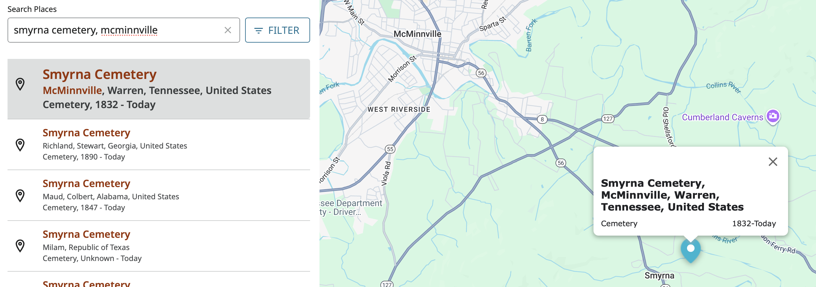 In FamilySearch Places, there are 4 US places "McMinnville," but none are in Smyrna County, Tennessee.