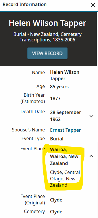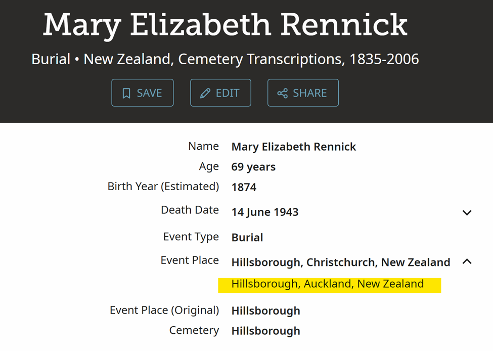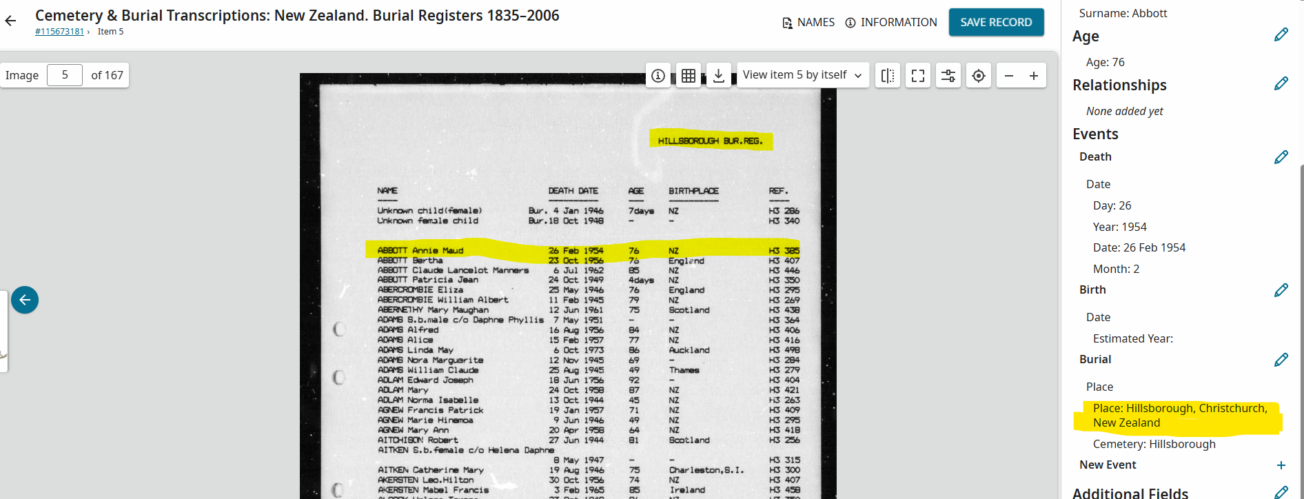 This collection seems to have been recently updated (currently dated 20 Jan 2026). A group of records relating to burials in the Hillsborough Cemetery (standardised place Hillsborough Cemetery, Hillsborough, Auckland, New Zealand) has been incorrectly indexed with a place of Hillsborough, Christchurch, New Zealand. This is in #115673181, item 5. There is such a suburb in Christchurch, but that is not the correct place (the two Hillsboroughs are about 1000 km apart). It seems that this error is repeated for all burial transcriptions in that item (cemetery).