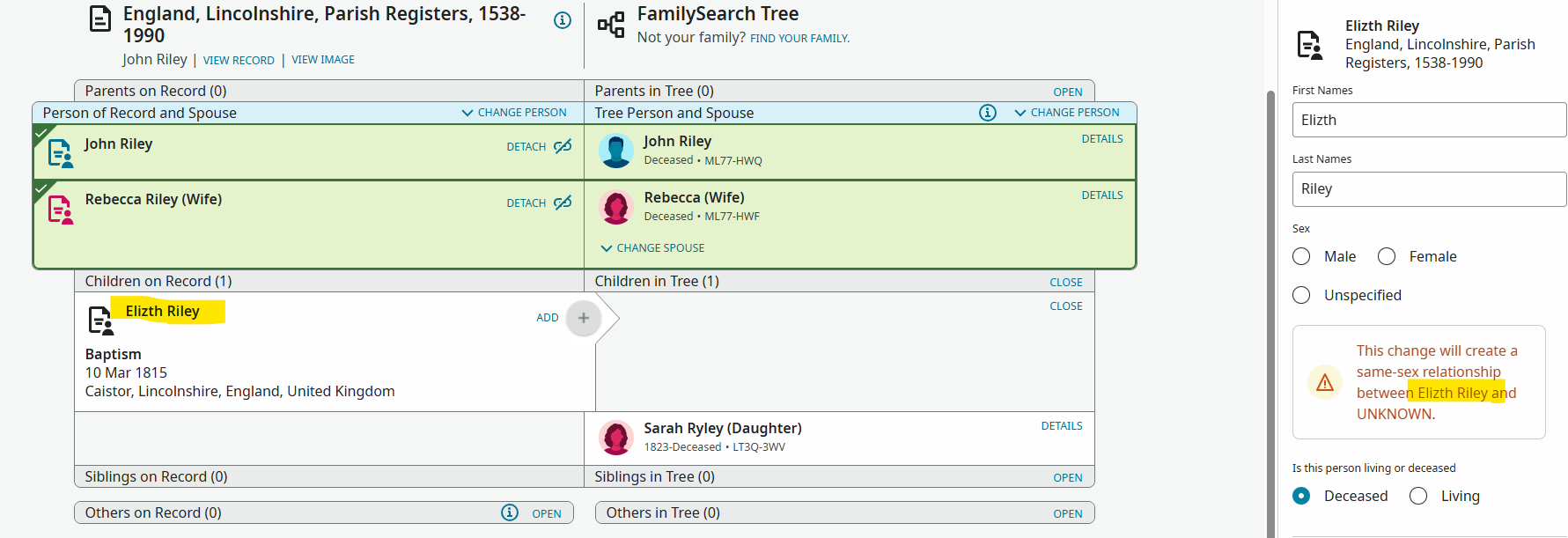 In the source linker, I was attaching a baptism source from the England, Lincolnshire, Parish Registers, 1538-1990 collection. The child Elizth did not already exist and, when I clicked ADD, the resulting dialog in the side bar displayed this message: