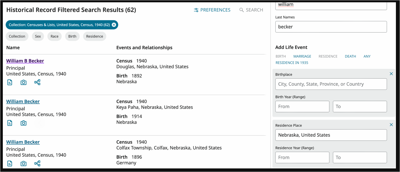 Noticed tonight that the county is off for several Nebraska relatives. Doing a record search for William Becker in 1940 census and residence of Fillmore County in Nebraska does not yield result. Removing the county name and just searching Nebraska yields correct family but shows them in Douglas County.