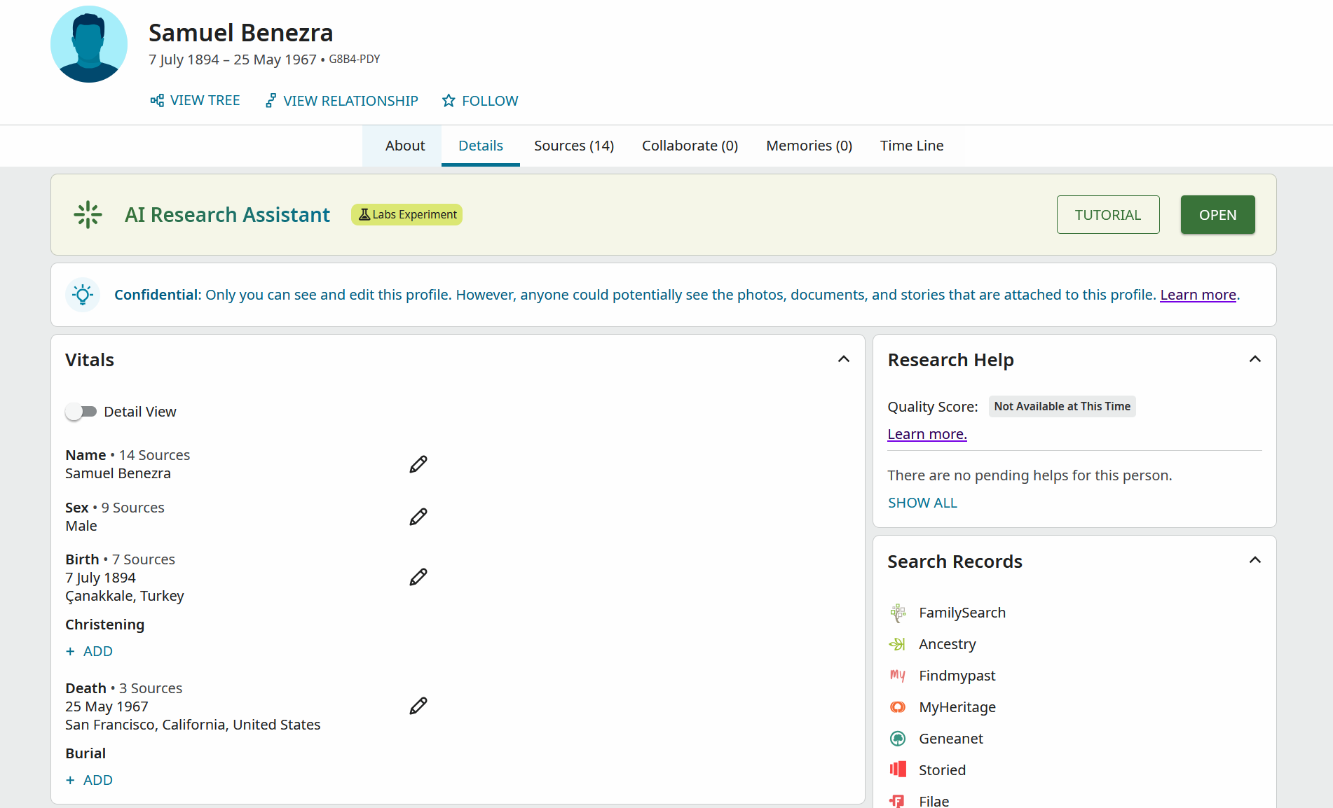 I thought that maybe there is a 'duplicate' somewhere in the FamilySearch Group tree, but didn't find one. In looking at his children none of them show 'Confidential', but his spouse, Louise Gaston does…