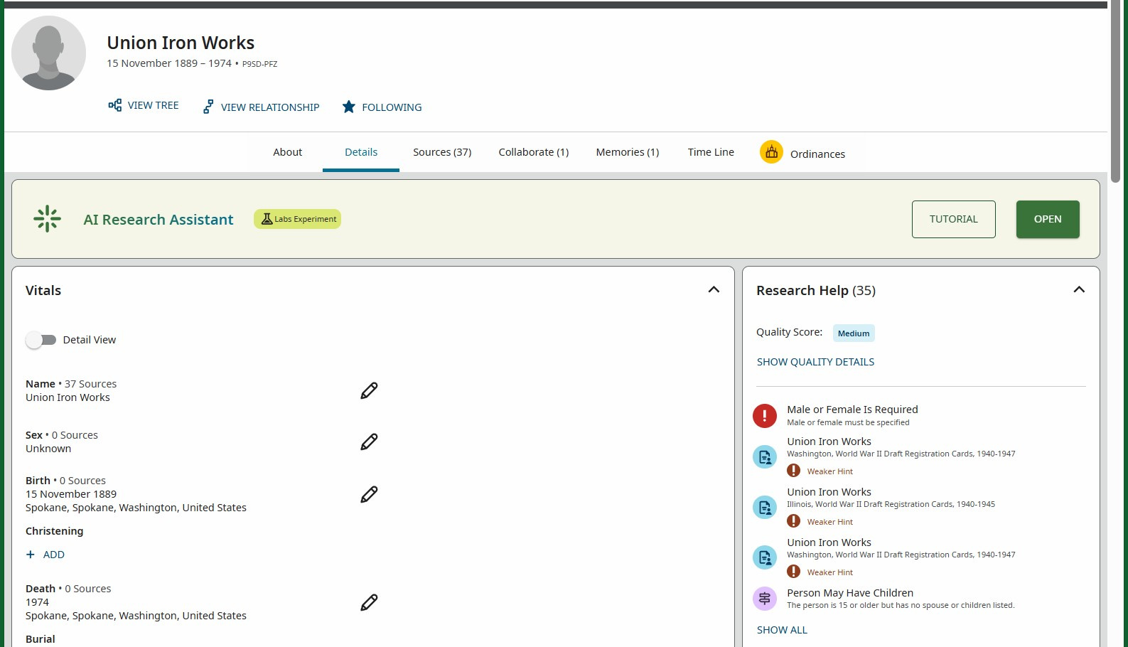 @Jack Hern I think it is great that you are searching for the names on the Draft Registrations attached to Union Iron Works and linking the sources to the people on the records. As I thought about your activity, I had some concerns I'd like you to consider. If you look at the "Find a Person" screenshot you shared, it says that FamilySearch is "A Family Tree for the Human Family." I noticed that you are a member of the Church of Jesus Christ of Latter-Day Saints, so you have some understanding of the sacred ordinance work we do for our deceased ancestors. What if someone assigned a gender to your fictitious name of a person you have created? This could easily be done because it is a worldwide organization offering genealogical records, education, and software all over the world. What I mean by saying that, there might be many other language speakers looking at the record, trying to prepare this person for ordinance work. They might think that Union Iron Works is a real person's name, see a gender on the record, and then your fictitious name has a gender, wasting precious time on ordinance work for Union Iron Works. There might be a better platform for you to search for Iron Foundries.