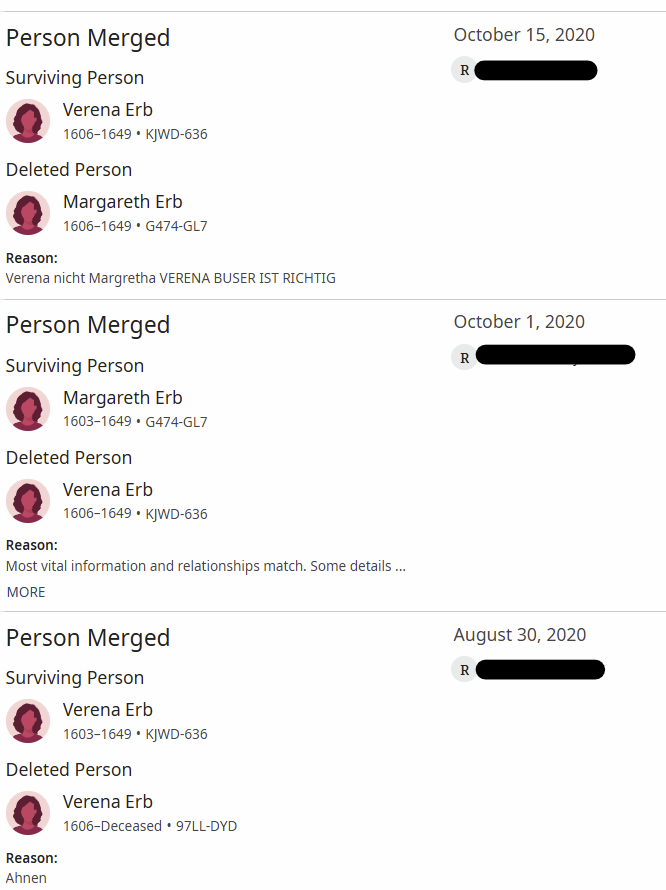 I am having a problem with Verena/Margreth Erb KJWD-636. Somewhere that I can't find her name changed from Verena to Margareth in the dozens of merges. If you look on Hans Erb GHPZ-W6Z Verena Erb chr 1606 (KJWD-636) was added as a child, which is correct. Then somewhere her name was changed to Margareth and birth date to 1603 with same ID number. She was then deleted from Hans and Elsbeth Bachmann Erb because Margareth 1603 does not belong. However I can not restore her with her correct information because she no longer exists. There are several notes on This Hans Erb and also on the Hanns Erb (L8Y7-7CS) married to Verena Steiner, which is where Margareth belongs. I need to add Verena Erb back on the family of Hans Erb and Elsbeth Bachmann K8HZ-753. Verena was Christened 31 Oct 1606 in Rothenbach Im Emmental, Bern, Switzerland. Her Baptism was 21 Oct 1970 IFALL, Endowment 29 Jan 1971 IFALL, sealed to parents 17 Apr 1971 IFALL. Can You do this on your end so we don't lose the ordinance dates? Thanks