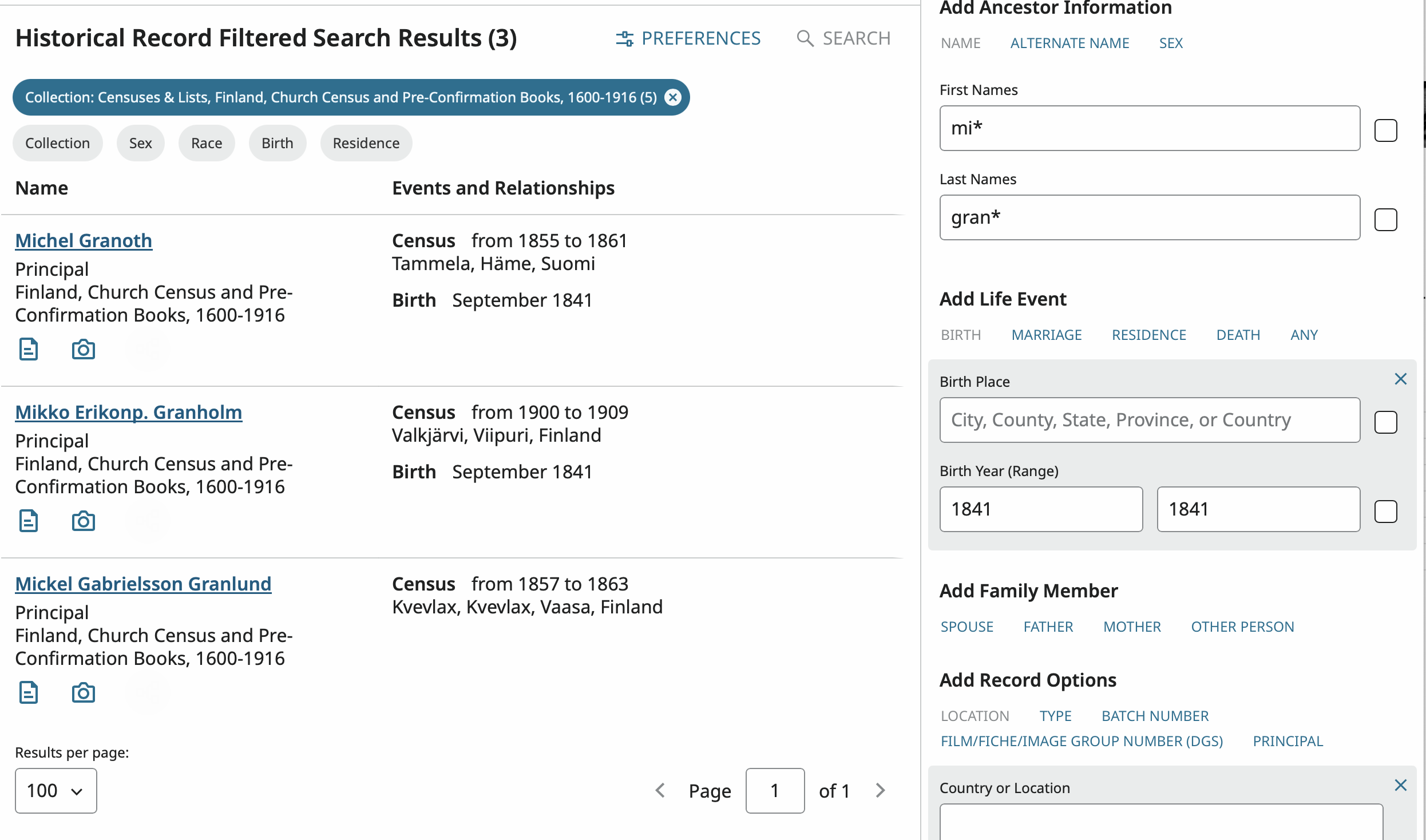 Fortunately, the search engine at FamilySearch uses a fuzzy routine which often picks up possible misspellings. Unfortunately, searching for Granroth in the collection this record is found in does not pick up Granoth. However, a wild-card search does: