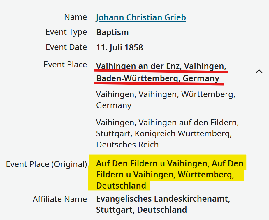 I am seeing MANY records giving the "old" location as Vaihingen auf den Fildern and the "current" location as Vaihingen an der Enz. And even when I force it to Vaihingen auf den Fildern, the era-specific names for Vaihingen ADF seem way out of wack. 1850? Nope.