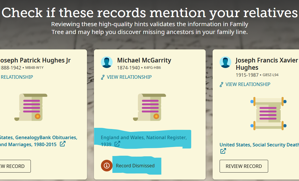 This morning, I received a hint from the 1939 E&W Register for a GG uncle. It has been dismissed, but I can't even see it.
