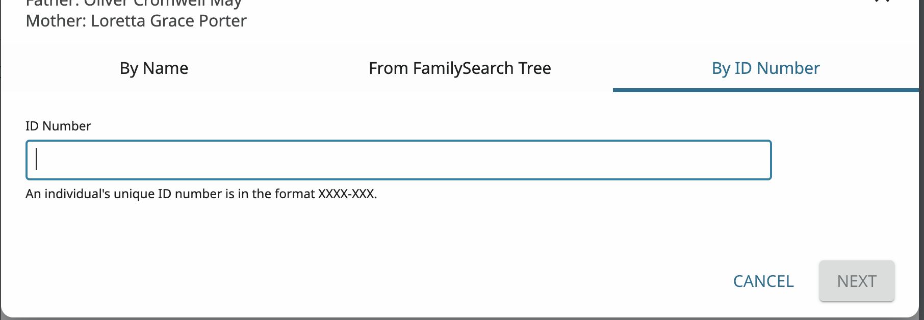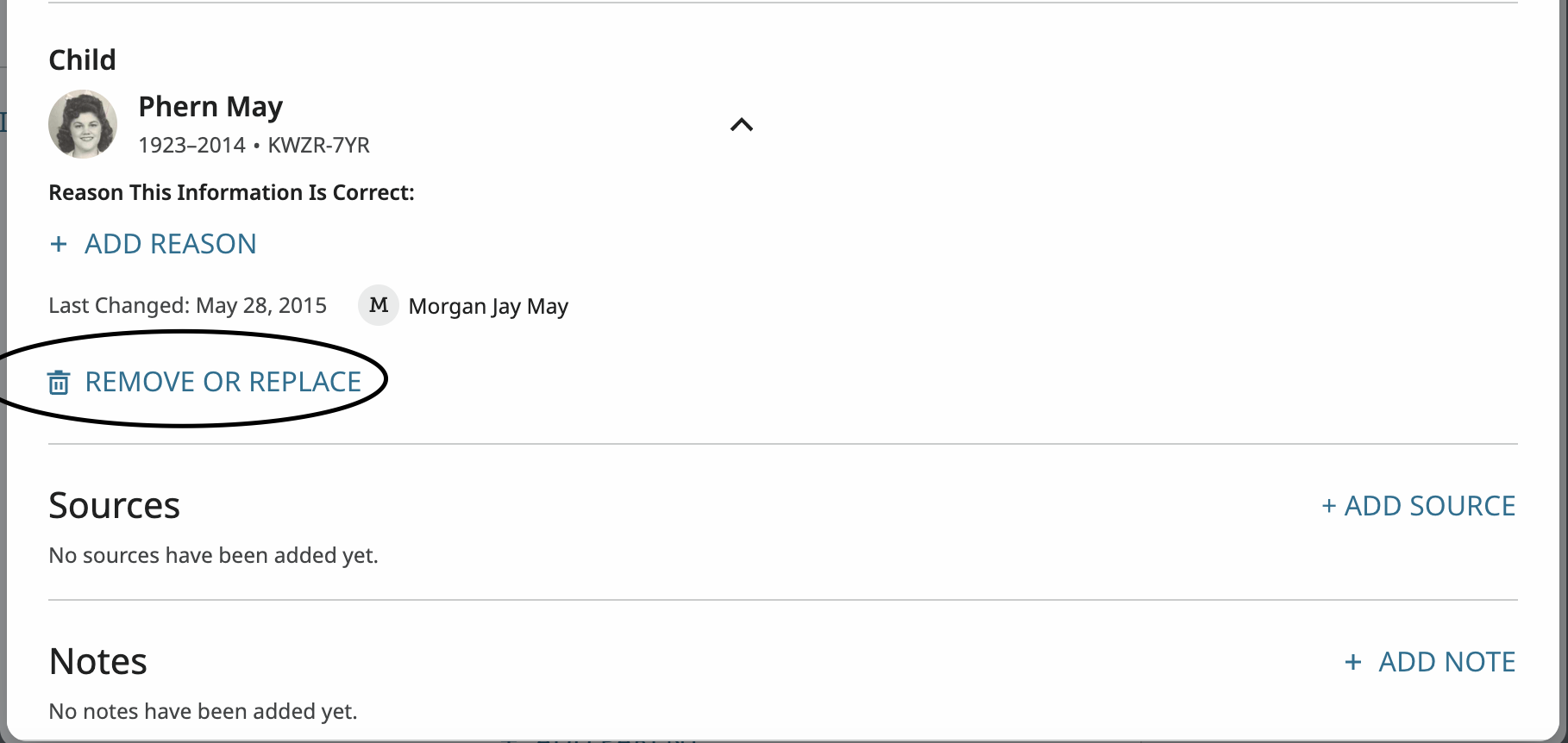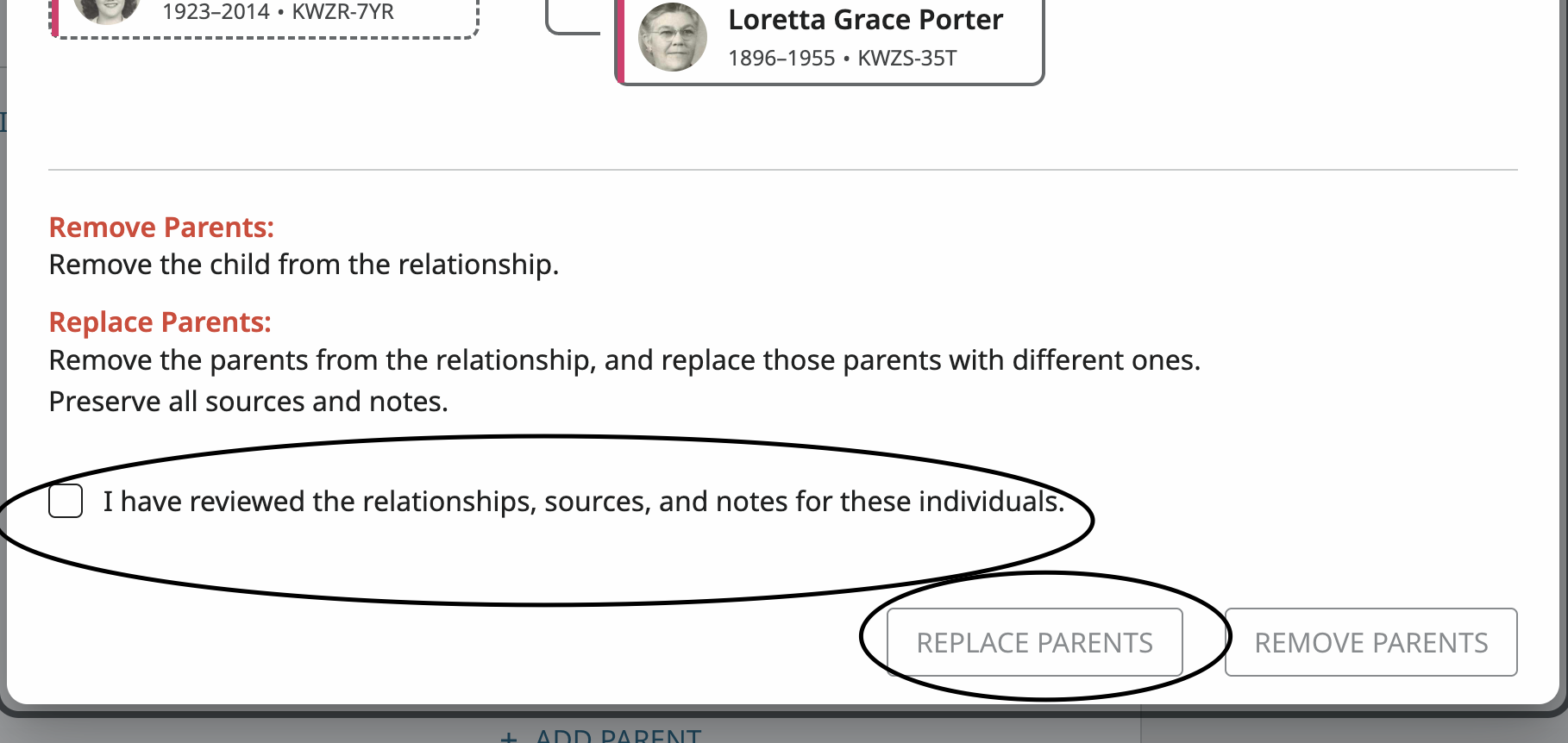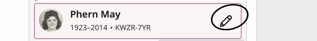 Use'el tradutor de Google. Parece que la has conectado con los padres equivocados. Por lo tanto, solo tienes que eliminar o reemplazar a la persona de la relación parental incorrecta y reemplazarla con los padres correctos. Para empezar, anota el número de identificación personal de la persona y los números de identificación personal de los padres a los que pertenece. Haz clic en el lápiz de edición y aparecerá una pantalla que te permitirá eliminar o reemplazar padres. Luego, debajo de la hija, haz clic en Eliminar o en Reemplazar Padres. Haz clic en la casilla "He revisado las relaciones...". Haz clic en "Reemplazar Padres" y luego en "Por número de identificación". Introduce el número de identificación personal del padre o de la madre. Sigue las instrucciones. Son algunos illustrasciones. Disculpa que las ilustraciones estén en inglés.