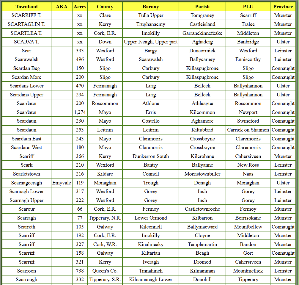 There are several places in Ireland - both townlands and parishes - with a name that could be spelled "Scarrof" phonetically.