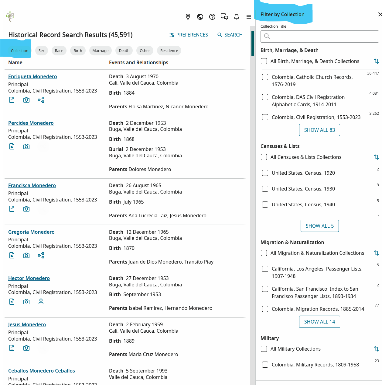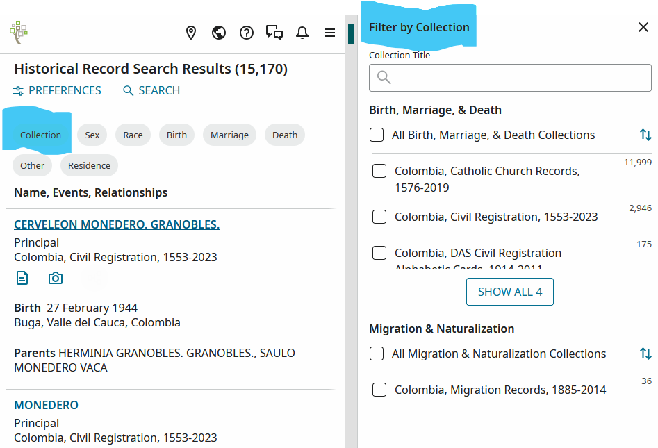 "Your first search is isolated just to collections from Colombia, 5 collections only."