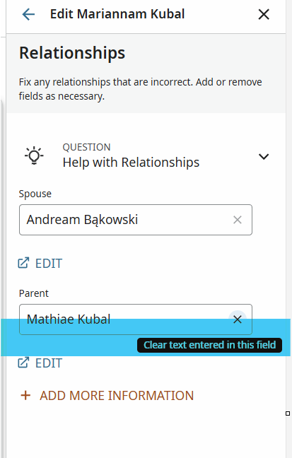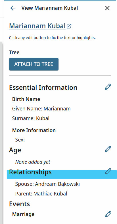 Unfortunately, Mathias Kubal is not Marianna's parent. As the record says in Latin, he is her former, deceased HUSBAND. How do I fix this record? (Marianna's actual surname is Pezała. I have the record of her first marriage to Mathias Kubal). Thanks.