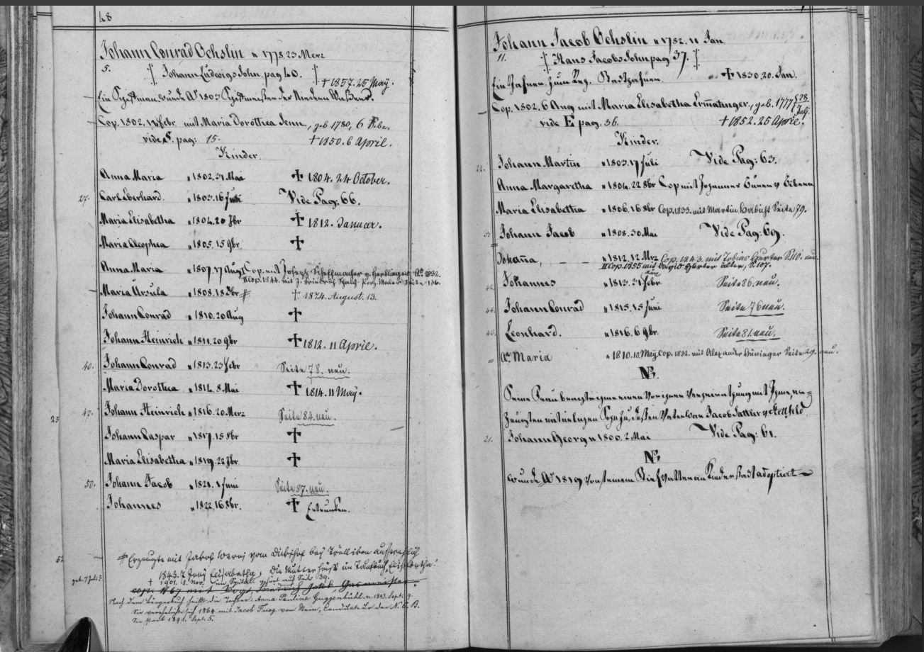 In the register on PG 49, family entry for Johann Jacob Oechslin and Maria Elisabetha Ermatinger, there is a note about Johann Georg 1800 2 May and someone 1819. Could I have an English translation of those two entries (the bottom two paragraphs)? It seems like it's saying something about adoption.