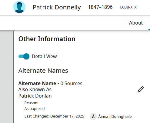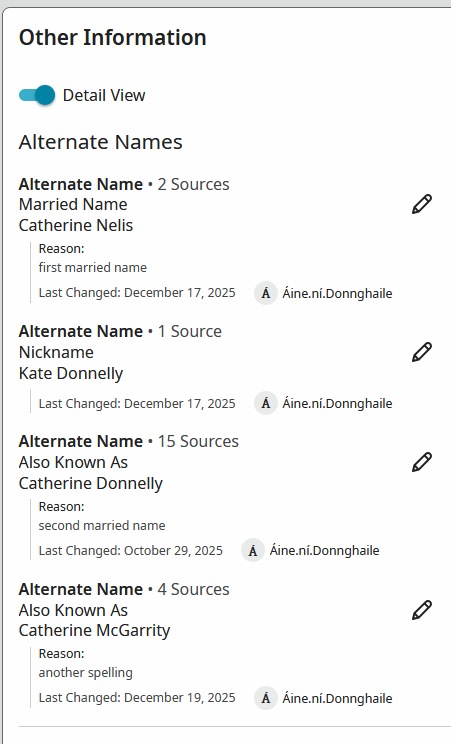In this example, I've listed nicknames, married names, and variant spellings for my great-grandmother.