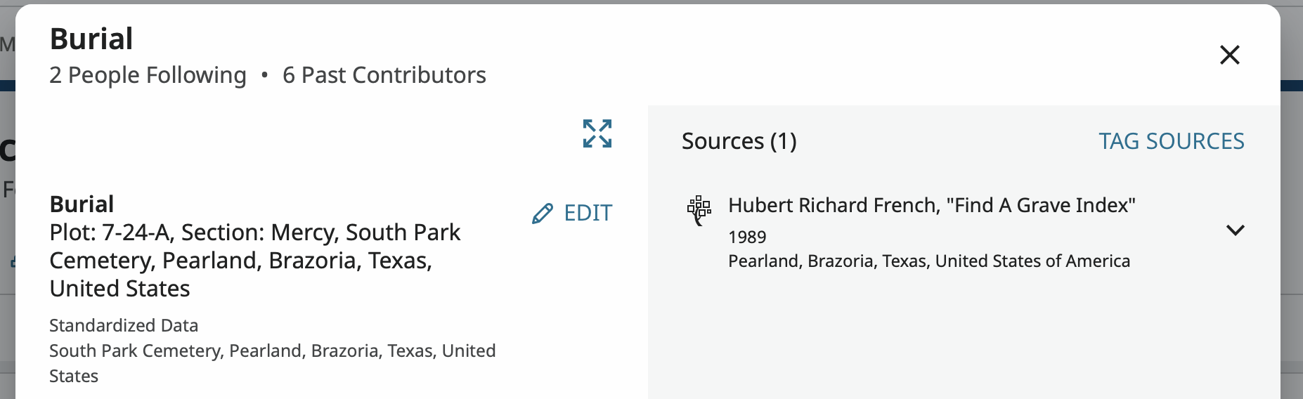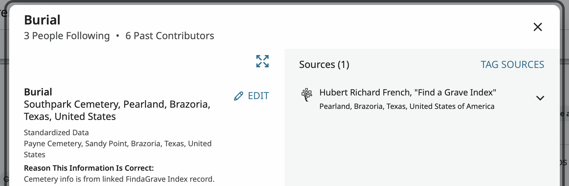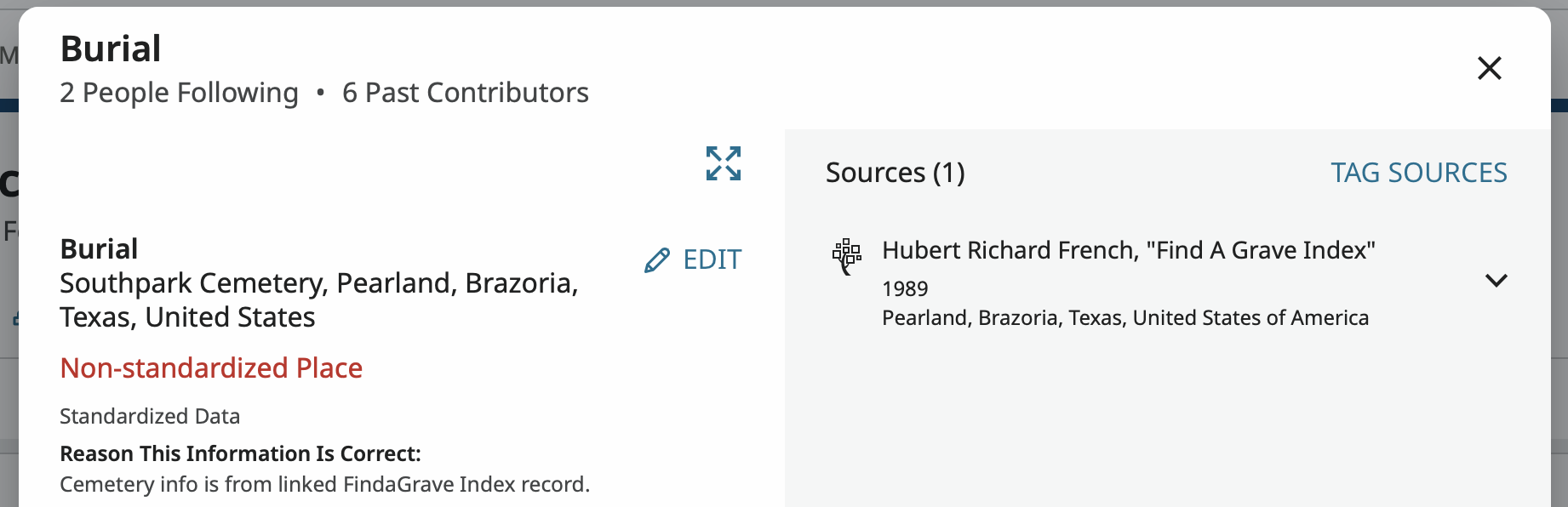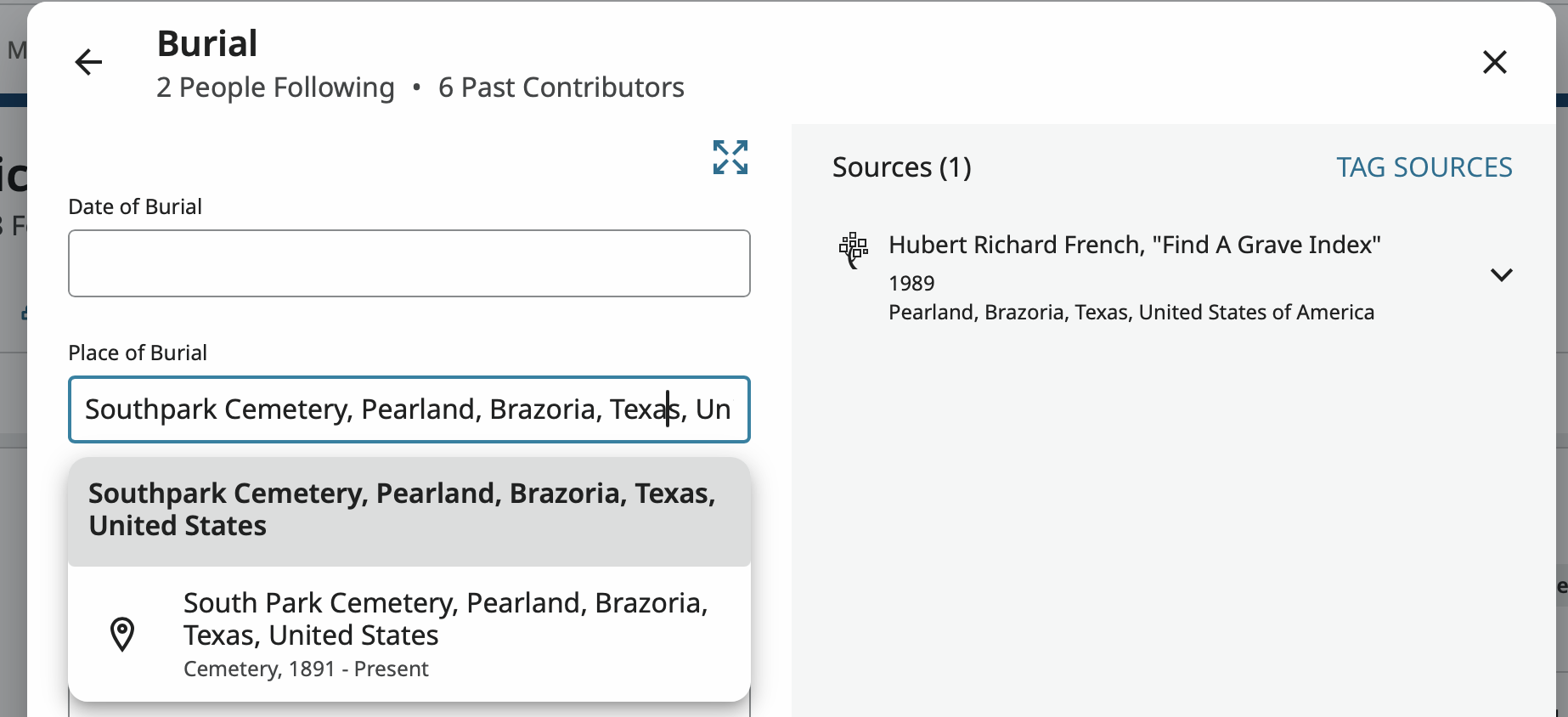 The 'Place of Burial' has the entry 'Southpark Cemetery, Pearland, Brazoria, Texas, United States' but it isn't standardized.