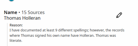 This brings me to my preferred entry method. I like to use the most common spelling of the name as found on a majority of attached sources from/during that person's lifetime as the primary entry. Name spellings change over time and getting a feel for the spelling at the time I think is showing the best acknowledgement of what the ancestor knew. This work we do is for them, and should not be about us or our modern day understandings.My very favorite source & reason is "by their own signature" often found on US draft registrations. Kind of hard to argue the person's own name when they are the one who spelled it out.