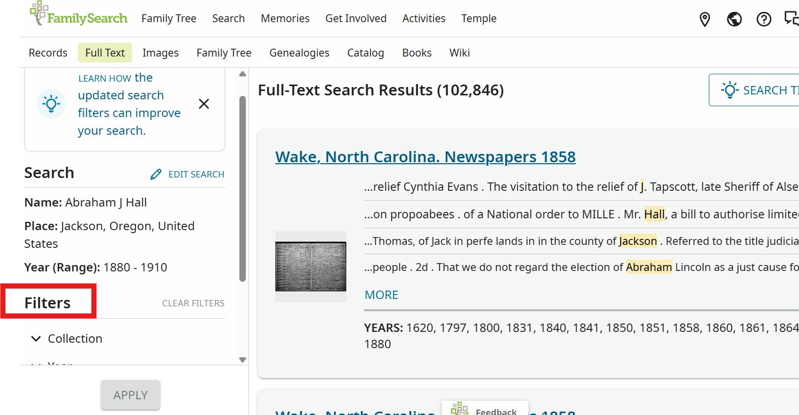 I was searching for an ancestor in Jackson county, Oregon and as you can see I got over 100,000 results, the first result being a newspaper article in Wake county, North Carolina. On the bottom left of the screen is the word filters. If you click on that you get a drop down box