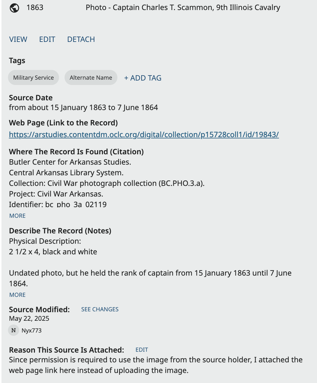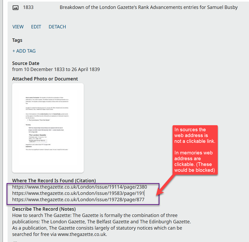 The attaching, editing and detaching of (properly archived) external sources are properly reflected in the profile change log and permitted to all (so properly collaborative), while Memory upload/removal support neither of these things (though tagging/untagging do get logged on the relevant profile).