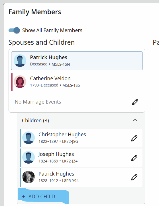When you add the child, a PID will be automatically assigned. In this example, the parents have 3 children, and "Add Child" is below the youngest known child.