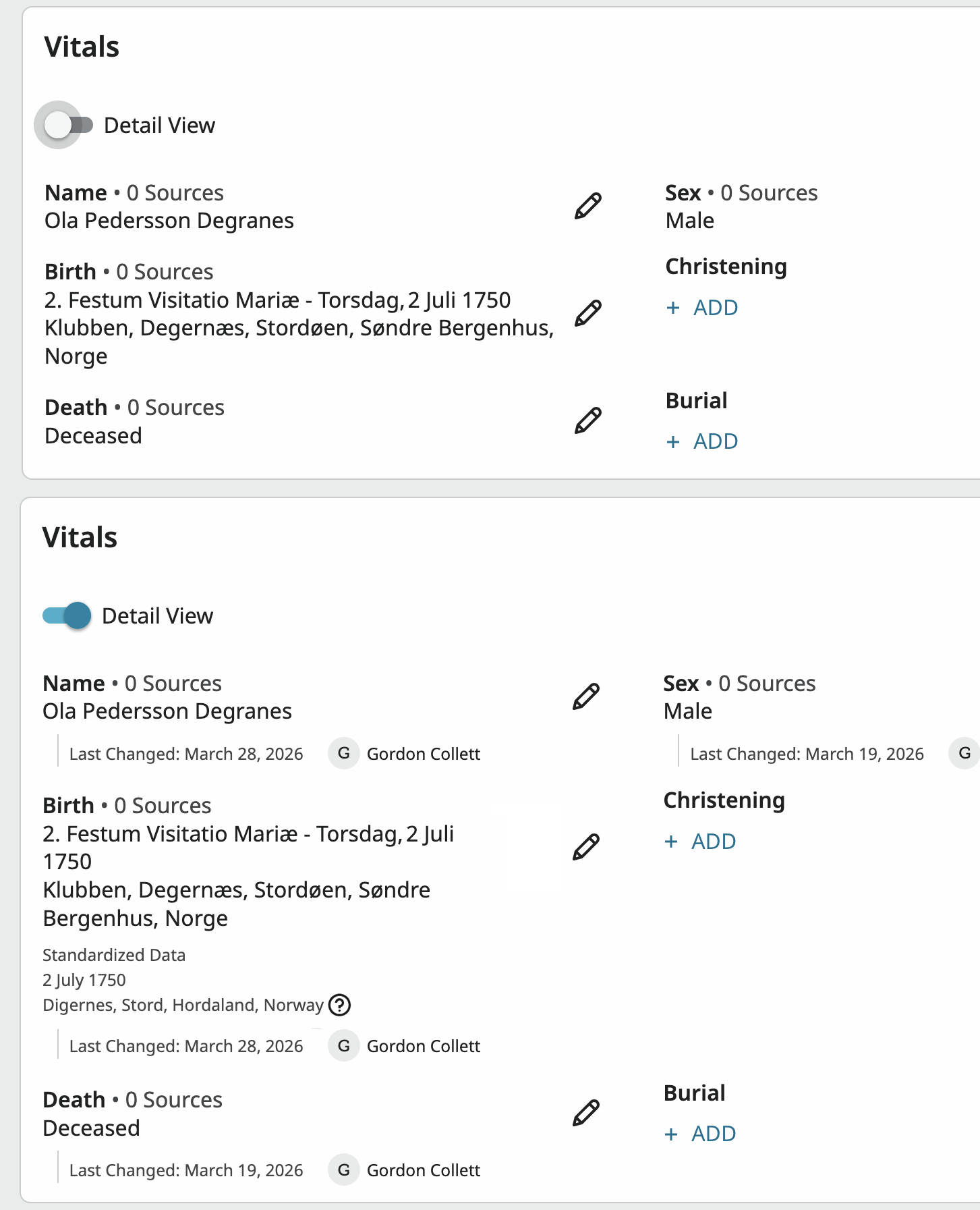 As mentioned in the following discussion (https://community.familysearch.org/en/discussion/comment/601909#), the display value does not change with the language of the site, even when it is standardized in one language. Would it possible, when the date and place name is standardized, that also the display values would automatically translate to the language of the site?