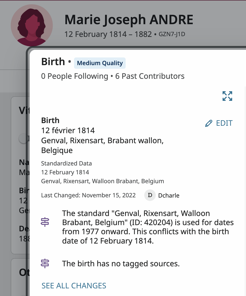 Now I would have the question, was the municipality of Genval just the village of Genval? Or is the Places database incomplete? Should there be both the village and a larger municipality with the proper pre-1977 name being Genval (the village), Genval (the muncipality), Brabant (the province), Belgium? If so, then a request would have to be made to the Places Authority team through the link on the Places database page to improve the place name.