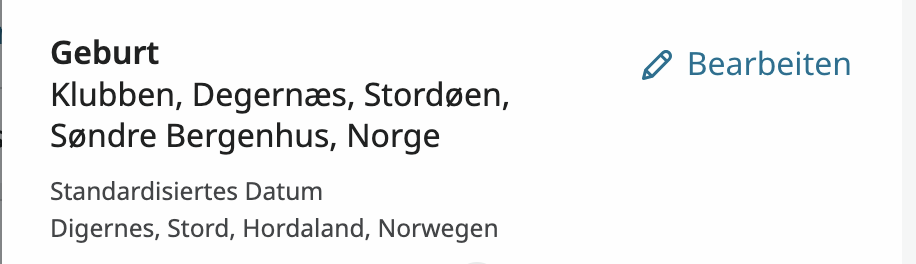 For example, if I have a person born at the tenant farm of Klubben which is part of the farm Digernes which is located in the community of Stord, Vestland, Norway in 1830, the correct historically precise way to enter this is: Klubben, Degernæs, Stordøen, Søndre Bergenhus, Norge. When I enter this and link it to the appropriate standard with the website set to Norwegian then change to English, German, and Chinese this is what I see in the data pop-up view or in the tool tip when hovering over the place name :