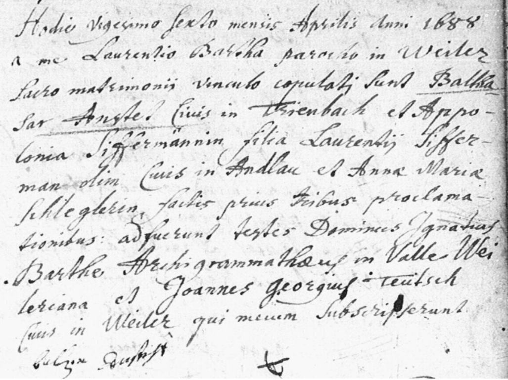 Translation:Today, the twenty-sixth day of April in the year 1688, I, Laurentius Ba__ha, parish priest of Weiler, joined in holy matrimony Balthasar Angstet, a citizen of Trienbach, and Appolonia Siffermann, daughter of Laurentius Sifferman, formerly a citizen of Andlau, and Anna Maria Schlegler, following three prior banns: Witnesses present were Ignatius Barthe, a notary in the Weiler Valley, and Johann Georg Teutsch, a citizen of Weiler, who signed with me.2 -