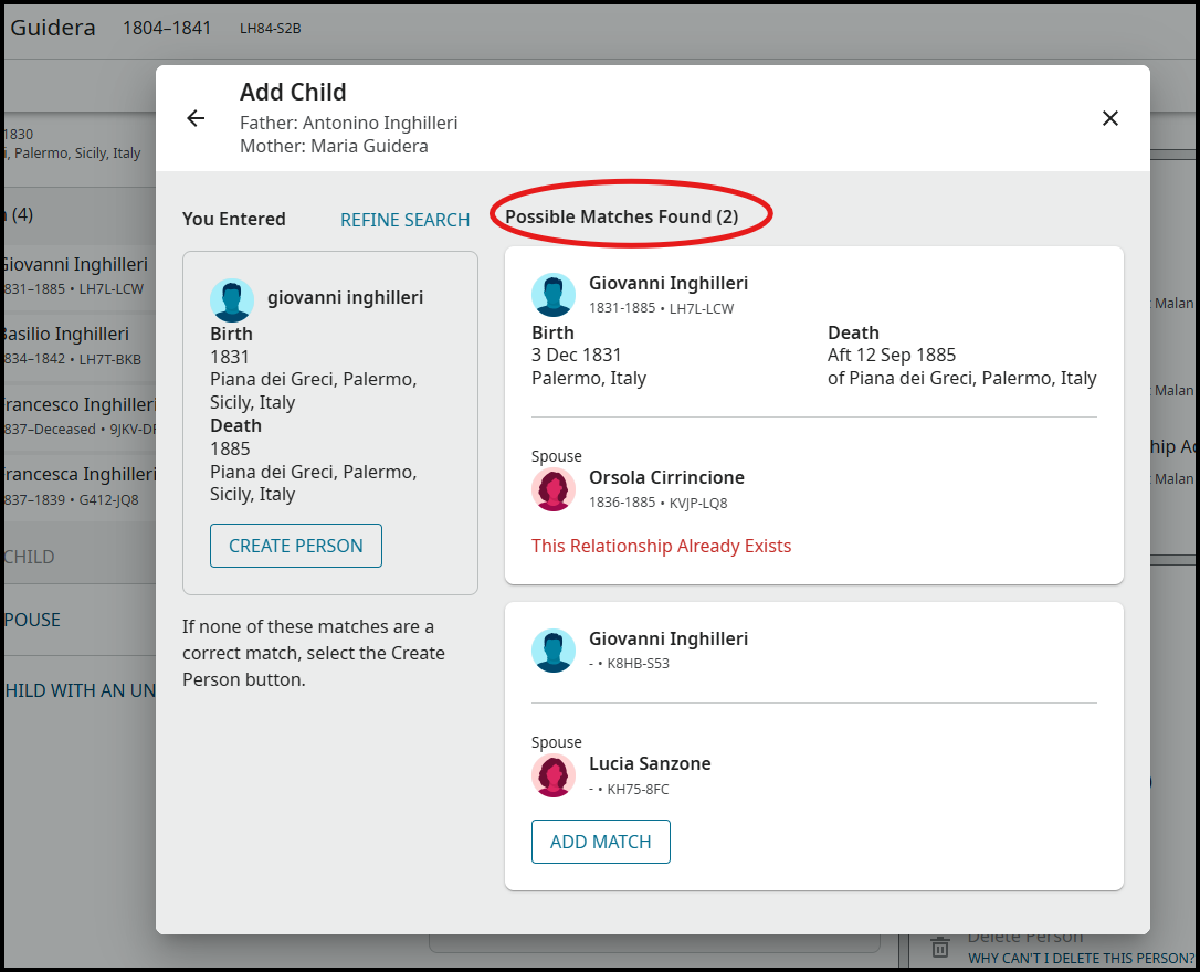 Start with yourself. Add your parents and your grandparents to connect with other deceased people already existing in the FamilySearch Tree. What you are doing is working from yourself back one generation at at time. You will need to add any living ancestors to connect to deceased ancestors who may already exist in the FamilySearch Tree. When you add people, the system searches for possible candidates who already exist in the tree. You might see a pop-up that reads Possible Matches Found: