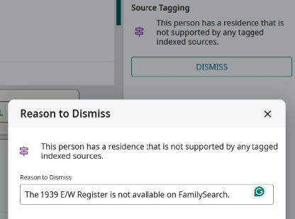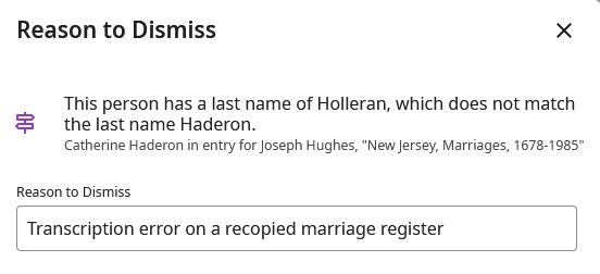 Unable to dismiss a DQS flag when the gender is misreported in a census record. For example: LB9F-NT5 Is incorrectly listed as "son" which indicates male. Her name is also misrepresented but that can be dismissed with an explanation. However, the faulty sex entry cannot be dismissed.