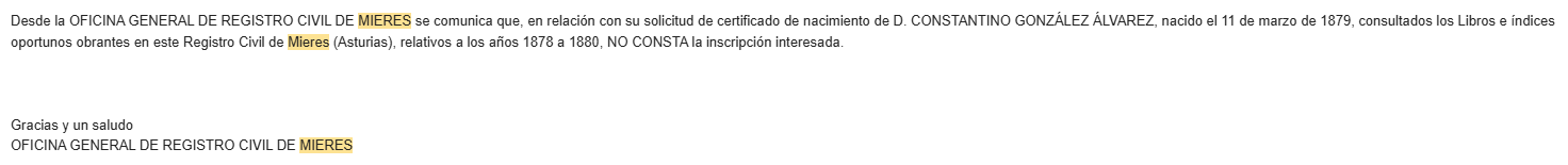 He buscado por varios años, pero no he podido localizar dichos documentos, en el Registro Civil de Oviedo dice que no consta inscrito en esas fechas 😥
