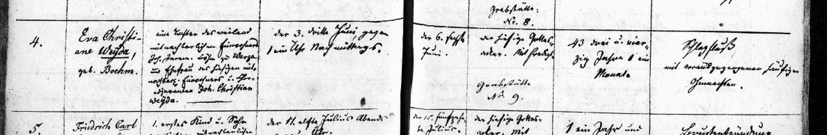 Parents/Spouse - a daughter of the deceased resident neighbor Joh. Jerem. Böhm in Warza, and wife of the local resident neighbor and [can't read] Joh. Christian Weÿda