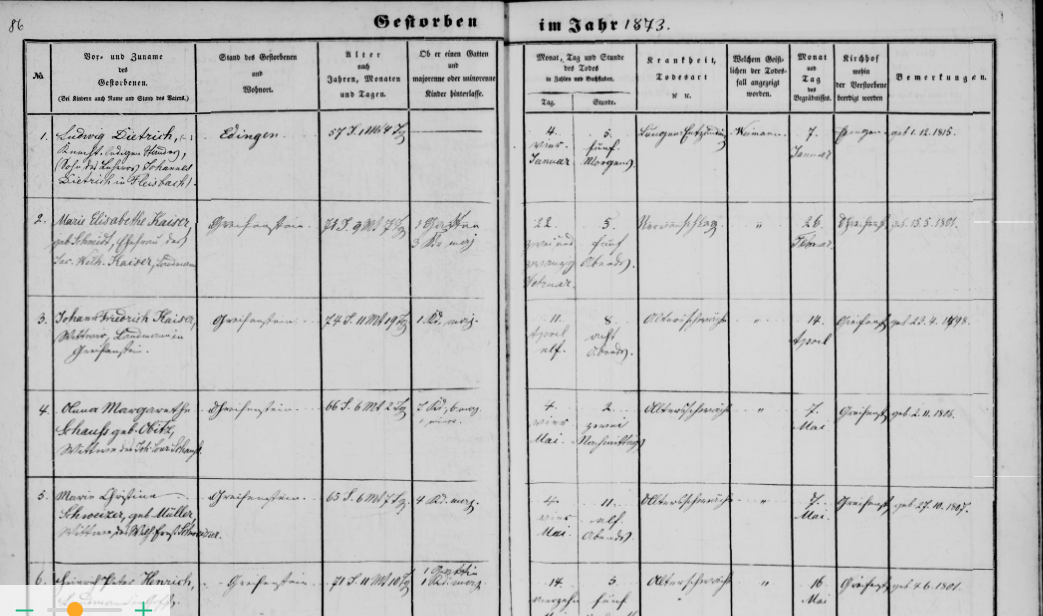 1873 Marie Elisabethe Kaiser, nee Schmidt, wife of ???Wilhelm Kaiser, farmer?? age 71 years, 9months , 7 days. next column??? died 22 February, 5:00 evening , ??? buried 26 February, born May 15, 1801 Greifenstein