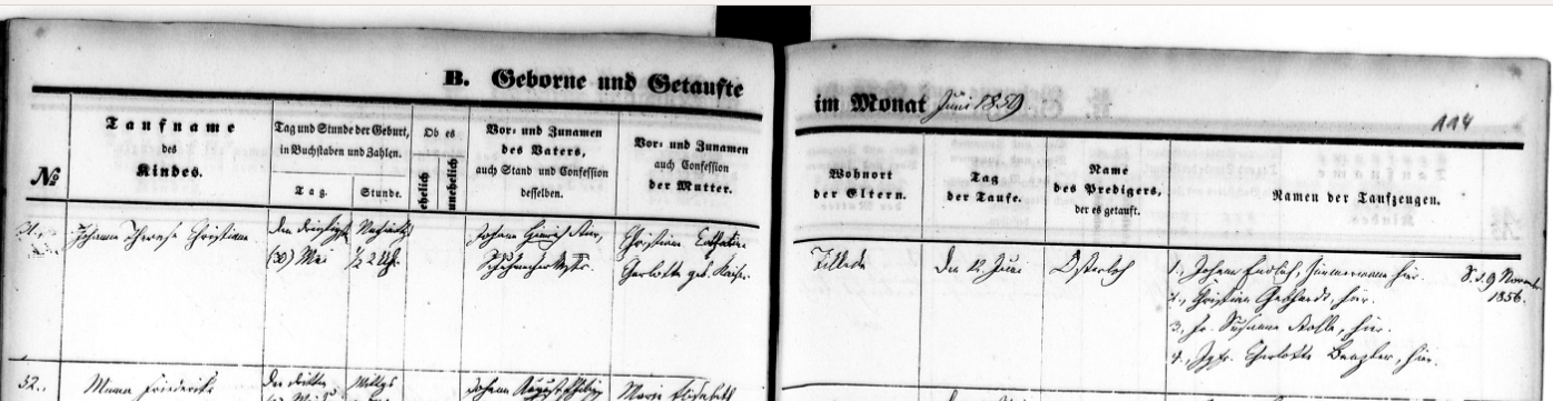 No. 31Name of the child:Johanne Therese ChristianeDate and time of birth:30 May [1859] 1:30 p.m.Name of the father:Johann Heinrich Stier, master shoemakerName of the mother: Christiane Catharina Charlotte née KaiserResidence of the parents:TilledaDate of baptism:12 JuneName of the cleric:OsterlohNames of the witnesses:1. Johan Endlich, carpenter here; 2. Christina Gebhardt, here; 3. Ms. Susanna Stolle, here; 4. Miss Charlotte Benzler, here<note in the right margin:>S. d. 9 November 1856 (not sure what it refers to)0 -
