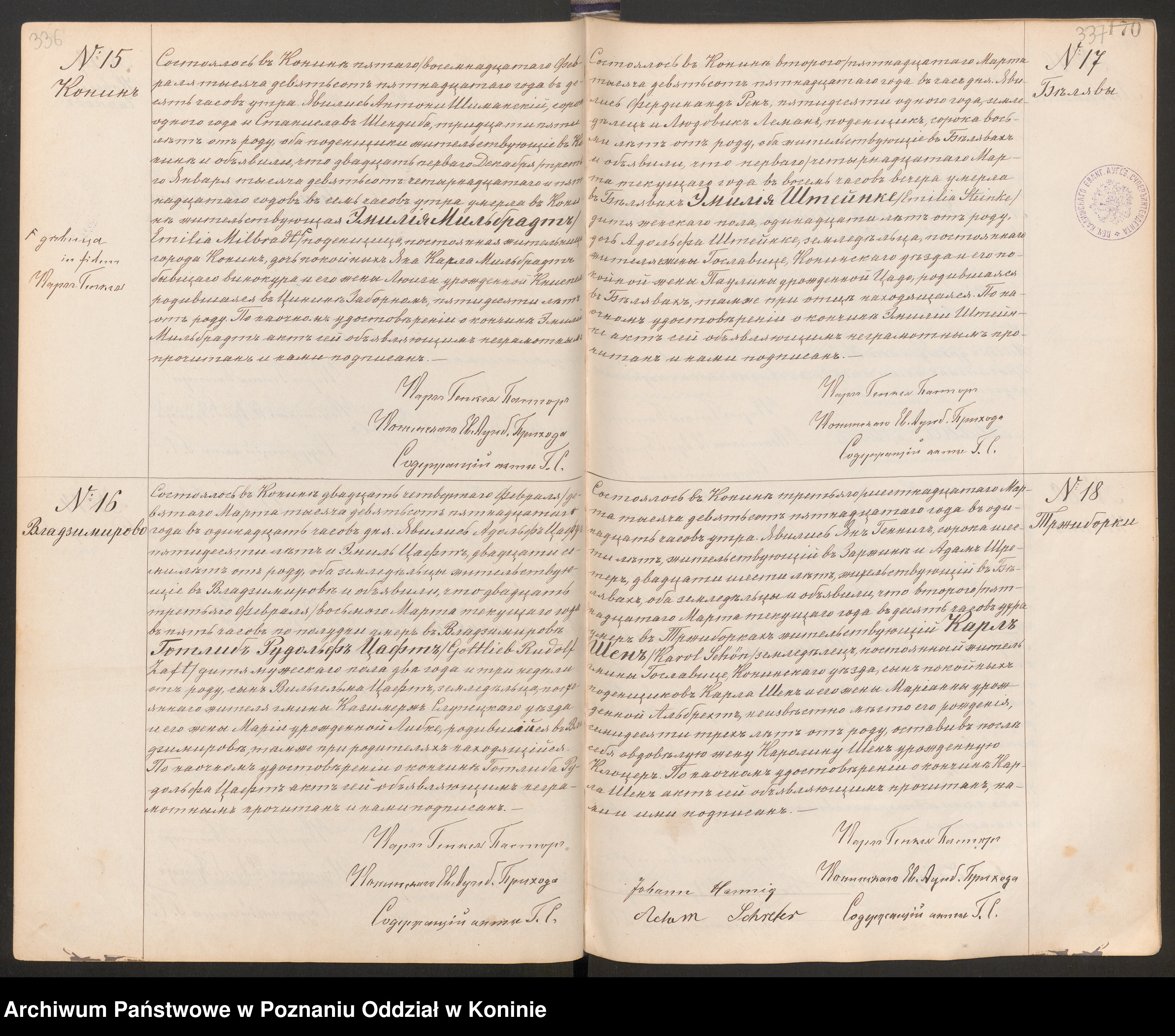 Death Record No. 15, Konin, Evangelical-Augsburg Parish, of Emilia Milbradt, who died in Konin on 3rd January 1915, death reported on 18th February 1815, she lived 50 years, she was a maid living in town Konin, daughter of deceased Jan Karl Milbradt, who used to be a distiller of wine, and of his wife, Luisa, born Kniespel, she was born in Cienin Zaborny. Death reported by Antoni Szymanski, 41 years old, and Stanislaw Szendyba, 35 years old, both laborers living in Konin.