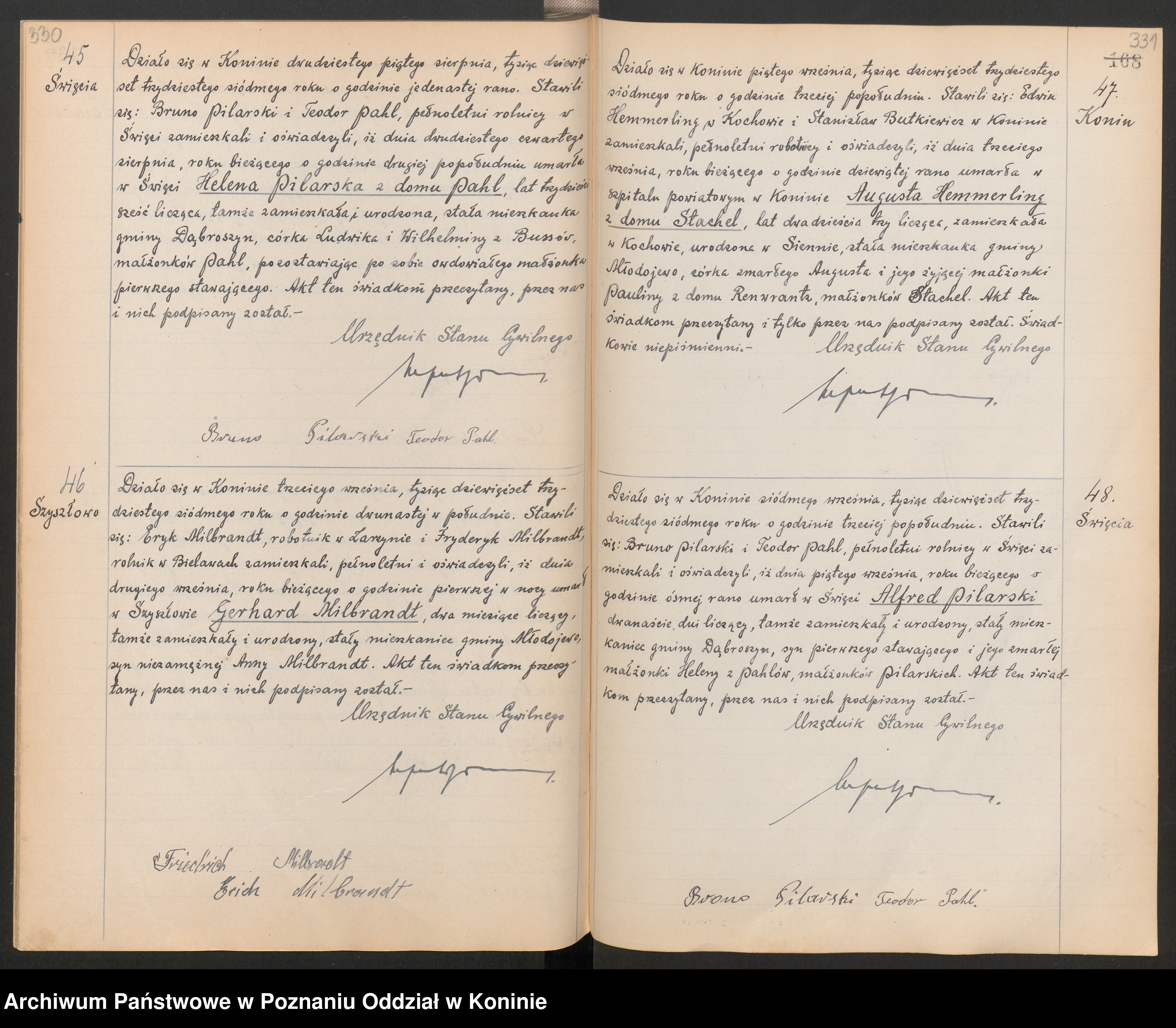 Death Record No. 46, Konin, Evangelical-Augsburg Parish, of Gerhard Milbrandt, who died in Szyszłowo on 2nd September 1937, death reported on 3rd September 1937, he lived 2 months, he was born and lived in Szyszłowo, a permanent resident of gmina (District) Młodojewo, he was son of unmarried Anna Milbrandt. Death reported by Eryk Milbrandt, a laborer in Zarzyn, and Fryderyk Milbrandt, a farmer from Bielawy, both adults. Signatures of Friedrich Milbrandt and Erich Milbrandt.