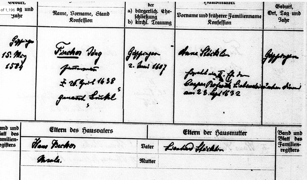 Birth, place, day, and year [for the husband] - Göppingen, 15 May 1584